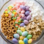 Dump the Cheerios Berry cereal, pretzels, speckled malt eggs, snickerdoodle bunny cookies, pastel candy corn, caramel M&Ms, and mini marshmallows into the bowl. Use a big spoon or your hands to gently fold everything together. You’re looking for an even distribution so every handful is a perfect bite of sweet and salty.