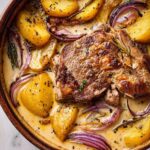 This Apple Cider Braised Pork Shoulder recipe features tender, flavorful pork slowly cooked in a savory apple cider and herb-infused braising liquid. The pork is seared to develop a rich crust, then braised with fresh apples, onions, garlic, rosemary, and thyme, resulting in a comforting dish perfect for a hearty family meal.