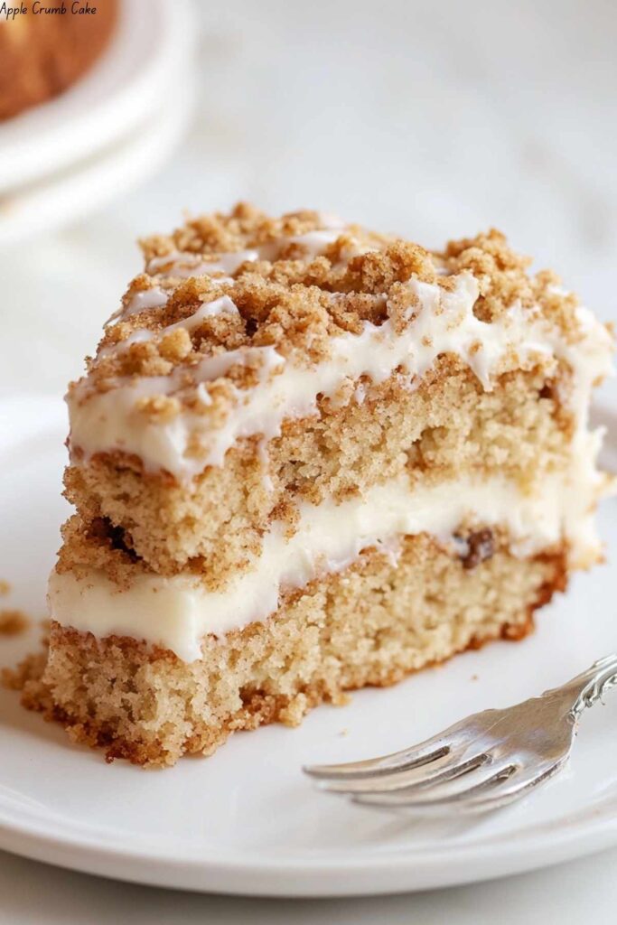Enjoy a slice of Apple Crumb Cake with a dollop of whipped cream or a hot cup of coffee for a delightful dessert experience.