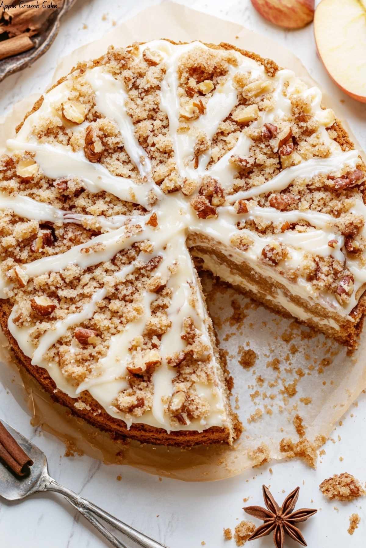 - Assemble the Cake: Spread half of the batter in a pan, top with apples and crumble, add remaining batter, sprinkle with crumble, bake until golden.