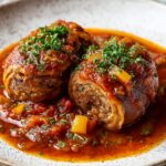 This Authentic Braciole Recipe features thinly sliced flank steak rolled with a fragrant herb and breadcrumb filling, browned to perfection, then slow-simmered in a rich tomato sauce until tender. Perfectly suited for serving over pasta, polenta, or mashed potatoes, this traditional Italian dish delivers melt-in-your-mouth goodness with herb-roasted flavors.