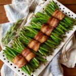 For holiday dinners, I like to arrange these bundles upright in a shallow serving dish so they look like a little green bean bouquet. Another fun way is to skewer a couple on cocktail sticks and serve as a finger food at parties — it’s always a hit and super easy for guests to grab!