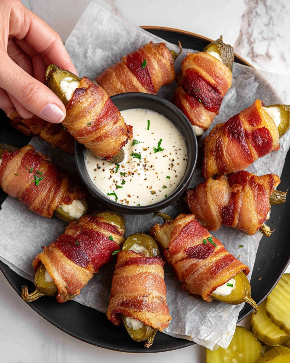 Bacon Wrapped Pickles are a savory and crunchy appetizer featuring dill pickle spears stuffed with creamy cheese and wrapped in crispy smoked bacon. This easy-to-make recipe combines tangy pickles, smooth cream cheese, and smoky bacon baked to golden perfection, perfect for game days, parties, or a flavorful snack.