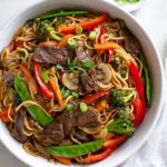 Heat your peanut oil in a large wok or deep skillet over medium-high heat. Add the seasoned beef in batches so it sears nicely — avoid crowding the pan. Once browned, transfer it to a plate. Add sliced onions, carrots, broccoli florets, snap peas, mushrooms, and bell peppers to the pan, stir frying until just tender-crisp, about 3-4 minutes. I like to keep some crunch in the vegetables because it balances the soft noodles and tender beef beautifully.