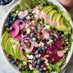 A vibrant and refreshing Blueberry Pistachio Spring Salad featuring a mix of spring greens, butter lettuce, candied pistachios, fresh watermelon radish, avocado, blueberries, pomegranate arils, and crumbled feta, all tossed together and drizzled with creamy pomegranate dressing. This salad combines sweet, tangy, and nutty flavors for a perfect light meal or side dish.