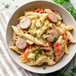 While the pasta cooks, heat a skillet over medium heat and melt the butter. Add your sliced smoked sausage and bell peppers, cooking until the sausage is browned and the peppers have softened but still have a bit of bite—around 5-7 minutes. This layer of flavor really sets the tone for the dish, so don’t rush it!