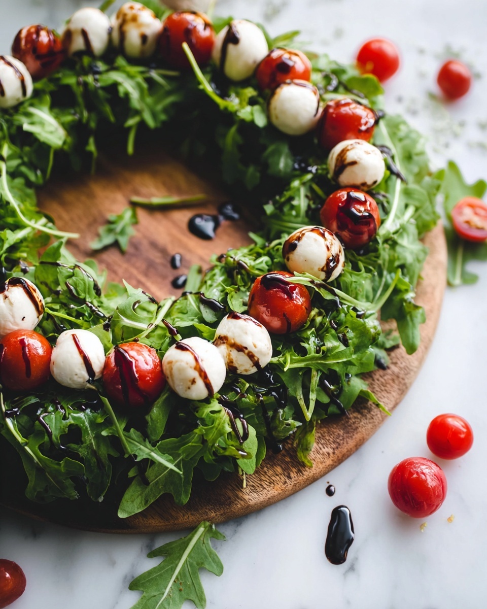 Keywords: Caprese salad, arugula salad, cherry tomato salad, mozzarella salad, Italian appetizer, fresh salad, no-cook recipe, holiday wreath salad