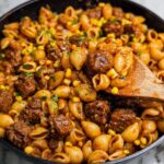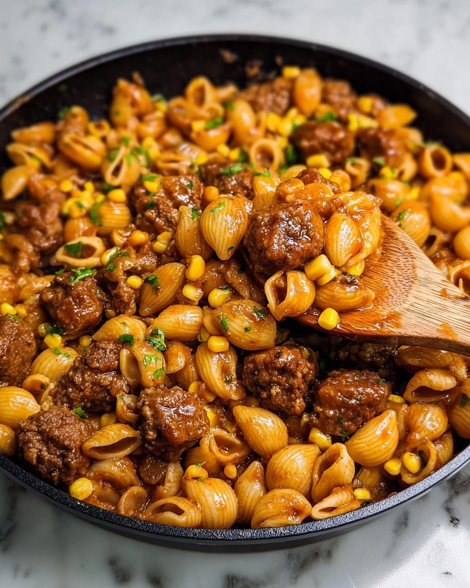 This Cheddar BBQ Ranch Meatball Pasta combines savory meatballs with creamy ranch and tangy BBQ sauce for a hearty, comforting one-pan meal. Featuring tender elbow macaroni simmered in chicken broth, this dish is topped with melted cheddar cheese and optional sweet corn, garnished with fresh green onions for a burst of freshness. Perfect for an easy weeknight dinner, it blends smoky, cheesy, and creamy flavors in every bite.
