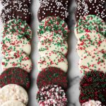 While the chocolate is still warm and soft, sprinkle generously with the white non-pareil sprinkles, the colorful red, green, and white non-pareil mix, and crushed candy canes. Don’t be shy here — the more festive toppings, the merrier! They adhere best while the chocolate hasn’t fully hardened, so this timing is key.