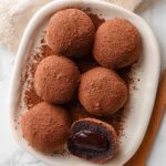 - Coat Mochi: Roll each assembled mochi ball in cocoa powder in a shallow bowl to coat evenly. Repeat this process until all mochi and ganache balls are used.