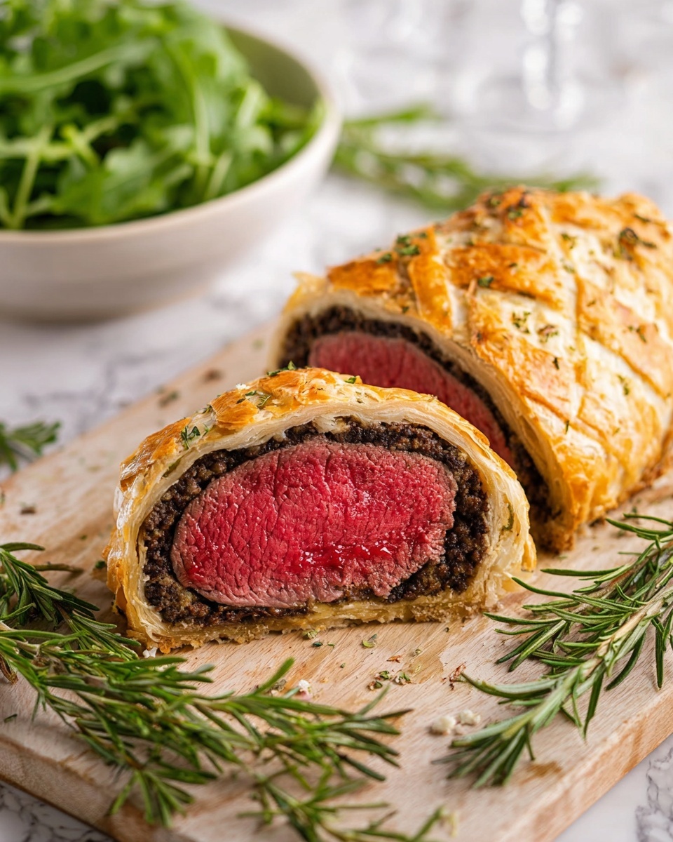 The puff pastry should be golden brown and crisp, and the beef ideally reaches medium rare—around 125-130°F (52-54°C) internal temperature. Letting it rest before slicing is key to juicy results.