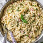 For holiday dinners, I try plating individual portions in wide shallow bowls, swirling the pasta nicely and adding garnishes right on top. Another fun idea I’ve done is serving the fettuccine in a large pasta bowl surrounded by votive candles and festive napkins to really up the Christmas vibes.