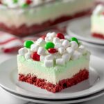 This festive Christmas Lasagna dessert features a vibrant red vanilla wafer crust, a creamy white cheesecake layer, and a refreshing green peppermint pudding layer, all topped with fluffy whipped topping and holiday-themed candies for a perfect holiday treat.