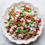 Christmas Puppy Chow is a festive, sweet and salty snack mix featuring Rice Chex cereal coated in a rich peanut butter and chocolate mixture, dusted with powdered sugar and cocoa, and mixed with holiday M&Ms and crunchy pretzels. Perfect for holiday parties and gift-giving.