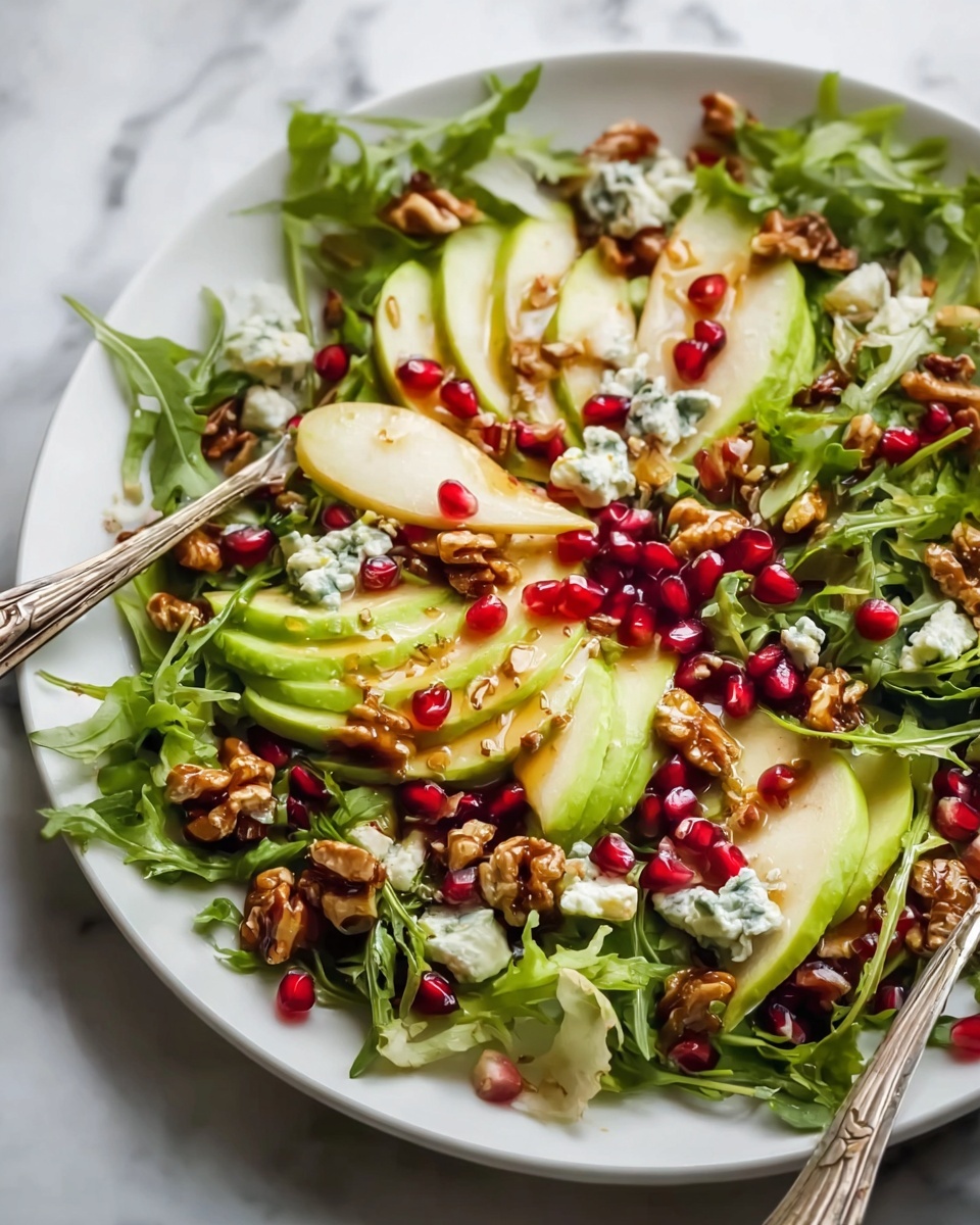 - Serve Immediately: Serve the salad fresh to maintain the crispness of the greens, the juiciness of the fruit, and the crunch of the nuts, making a perfect festive starter or side dish.