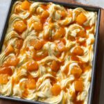 - Assemble the cake: Spread the mango whipped cream evenly over the soaked cake surface. Top with fresh mango chunks and sprinkle with ¼ cup toasted sweetened coconut flakes for garnish.