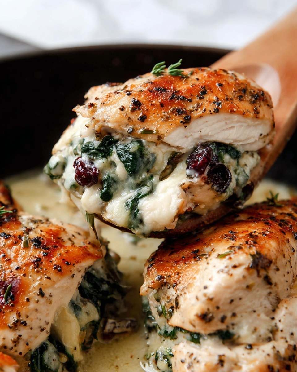 Fill each pocket generously with the spinach, cranberry, and onion mixture, then tuck long slices of brie inside—don’t skimp here, the brie melting inside is pure magic. Close the chicken pocket as best as you can and secure with toothpicks if needed. A tip: keep the chicken as tight as possible for even cooking and beautiful presentation.