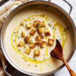 I keep it simple but flavorful with a handful of crunchy croutons I make at home (olive oil and garlic toasted bread cubes) and a drizzle of good olive oil on top for extra silkiness. A sprinkle of finely chopped chives or parsley gives a fresh pop of color and subtle brightness that balances the creaminess perfectly.