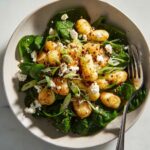This Crispy Gnocchi with Spinach and Feta is a delightful, quick-to-make dish combining golden, pan-fried gnocchi with fresh baby spinach, tangy Greek feta, and fragrant herbs. Finished with a squeeze of lemon and a hint of crushed red pepper, it’s a perfect balance of crispiness, creaminess, and fresh flavors for a satisfying meal or side dish.