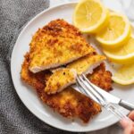 Parmesan Crusted Chicken is a crispy, golden-brown skillet-fried dish featuring tender chicken breasts coated in a flavorful blend of Parmesan cheese, Italian seasoning, and panko breadcrumbs. Perfectly seasoned and pan-fried to a crunchy finish, this easy-to-make meal pairs wonderfully with lemon wedges for a fresh, zesty touch.