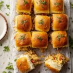 These Curried Chicken Slider Sandwiches are flavorful mini sandwiches perfect for gatherings or a satisfying meal. Tender chicken pieces marinated in a blend of aromatic Indian spices and yogurt are sautéed with onions and bell peppers, then layered onto slider buns with a zesty sauce and melted mozzarella cheese. Finished with a garlic herb butter glaze and baked to golden perfection, these sliders offer a delicious fusion of spice and creaminess.