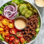 Here’s the fun part: layering all those delicious components. Start with a bed of chopped romaine lettuce to keep things fresh and crisp. Then add the savory ground beef, followed by the golden roasted potatoes. Scatter your halved cherry tomatoes, shredded cheddar cheese, slices of creamy avocado, and a handful of tangy pickled red onions. Finish by drizzling a generous amount of that rich and tangy special sauce all over. This is when everything comes together beautifully.