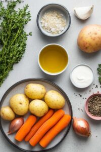 - Preheat Oven and Prepare Vegetables: Preheat your oven to 400°F (200°C). Peel and chop the carrots and potatoes into even pieces and chop the onion. Crush the garlic cloves to release their flavor.