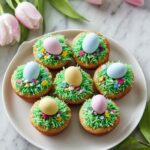 I love garnishing these cookie nests with a mix of green sanding sugar or finely shredded coconut tinted with green food coloring to amp up the “grass” effect. Sometimes, I sprinkle a little edible glitter on top of the eggs for a magical shimmer that kids adore—it makes the nests really pop on the dessert table!