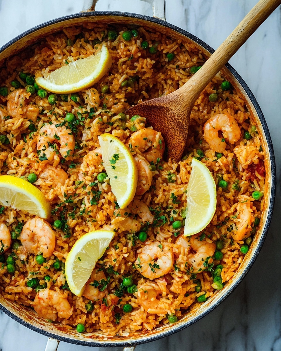 This easy garlic butter shrimp and rice recipe combines succulent shrimp sautéed to golden perfection with flavorful rice cooked in a fragrant mix of garlic, onion, crushed tomatoes, and peas. Finished with a luscious garlic butter sauce infused with white wine and fresh lemon juice, this dish is a quick yet impressive meal perfect for weeknight dinners or special occasions.