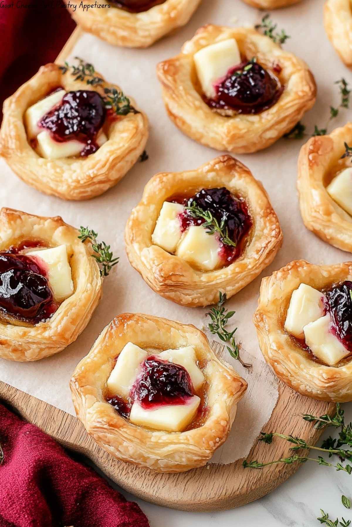- Cut and assemble: Cut the puff pastry sheet into squares. Spread jam on each square, top with goat cheese, and sprinkle with thyme.