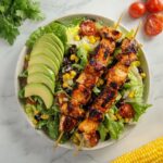 Cut the grilled corn kernels off the cob and add them, along with diced tomatoes, rinsed black beans, and sliced avocado, to your salad bowl. Toss gently with the remaining dressing so nothing overpowers the crunchy lettuce. Finally, place your grilled chicken skewers right on top. This not only looks inviting but lets everyone grab the chicken easily. You’re done—dig in!