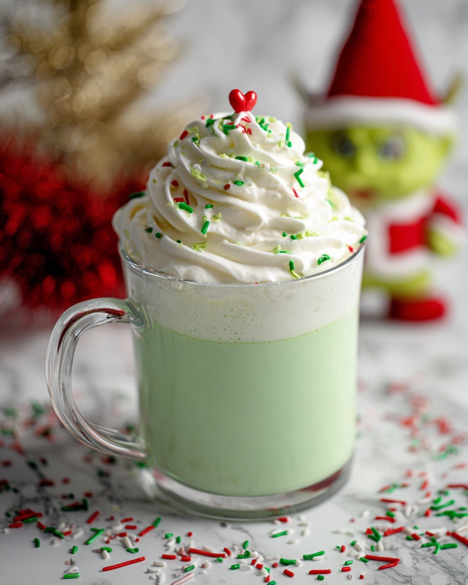 I always top mine with whipped cream and a sprinkle of crushed peppermint. Those bright red peppermint bits against the green drink just look so festive! Sometimes I add a few mini marshmallows or even green sprinkles for a little extra holiday cheer.