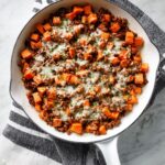 I prefer to reheat leftovers in a skillet over medium-low heat with a splash of water or broth to prevent sticking or drying. Cover it loosely to help the cheese regain some of that gooey texture. Microwaving works in a pinch but can make the sweet potatoes a bit tough if you go too long.
