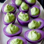 These Halloween deviled eggs are a spooky twist on a classic appetizer. The creamy avocado filling is colored with green, red, and blue food coloring to create a ghostly appearance that’s perfect for any Halloween party.