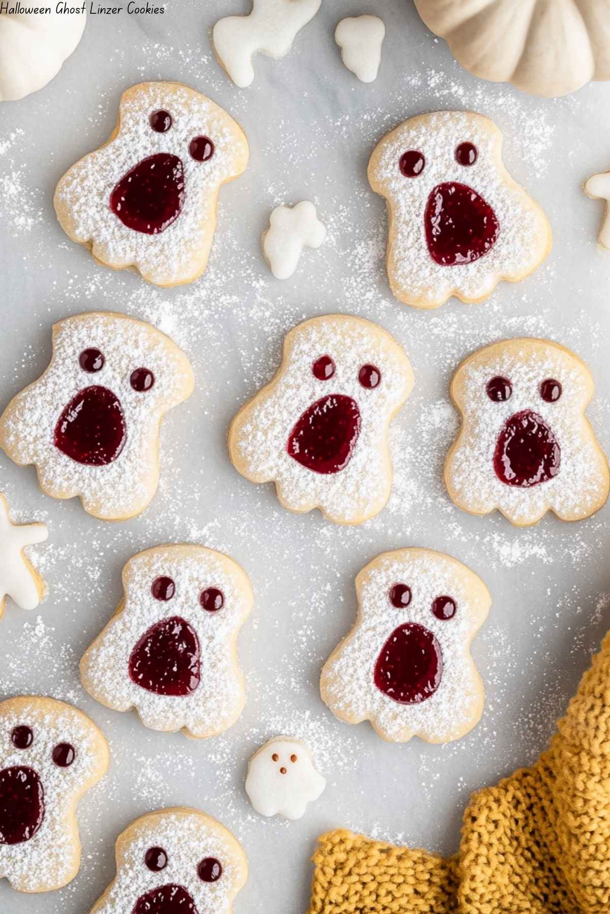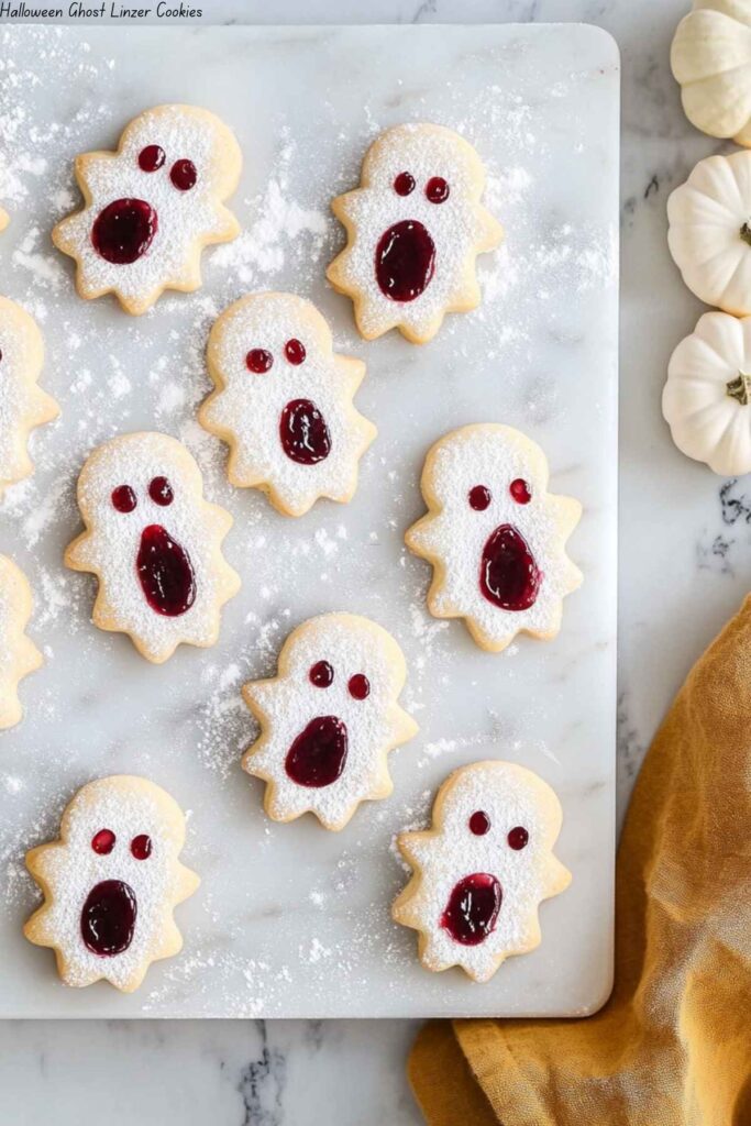 These Halloween Ghost Linzer Cookies are a spooky twist on the classic Austrian treat. Filled with jam and dusted with powdered sugar, these festive cookies are perfect for Halloween parties or as a fun treat for the family.