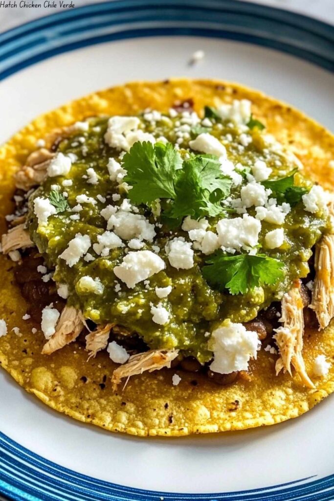 This Hatch Chicken Chile Verde recipe combines tender chicken with spicy Hatch chiles, onions, and garlic in a flavorful green sauce. Serve it with crispy tostadas topped with refried beans, Queso Fresco, and fresh cilantro for a delicious meal.