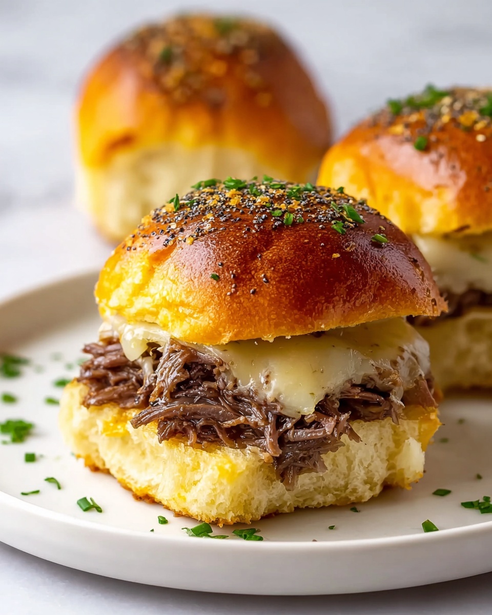 Mix the mayonnaise and garlic powder in a small bowl to create a simple garlic mayo spread. Slather that evenly over the bottom half of your rolls – this little touch adds creamy tang and depth. Next, pile on the shredded roast beef evenly across the mayo, making sure every bite will have meat. Then top the beef layer with slices of American cheese. Finally, gently place the top half of the rolls over everything, pressing lightly so the layers stick together but don’t get squished.