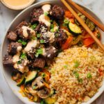 Keywords: hibachi steak bowl, Japanese steak bowl, teriyaki steak bowl, hibachi vegetables, easy steak dinner, sesame oil steak, stir fry steak, garlic ginger steak, fried rice bowl