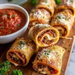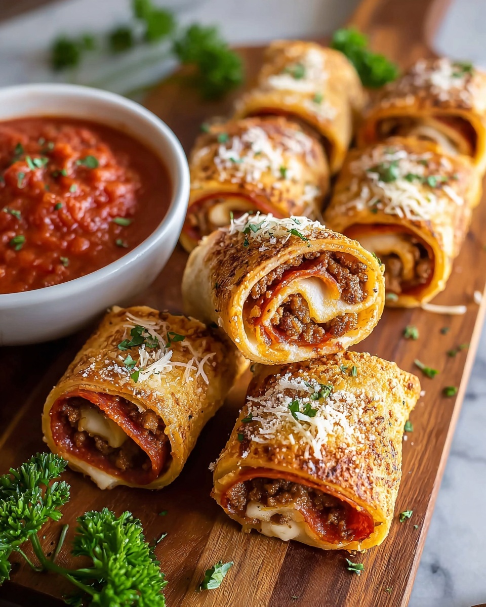 For a party or family gathering, I’ve arranged these pizza rolls standing up in a big glass jar or basket lined with parchment paper—makes for an easy grab-and-go snack station that looks festive. You can also slice each roll into bite-sized pinwheels and serve with dipping sauces like marinara, ranch, or spicy mayo for a crowd-pleasing appetizer.