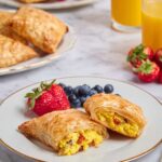 Roll out the thawed puff pastry sheets on a lightly floured surface to smooth any creases. Cut into rectangles about 4×6 inches—big enough to fold over a generous scoop of filling. Spoon your sausage-egg-cheese mixture onto half of each rectangle, leaving edges free for sealing. Wet the edges with a little water to help the pastry stick.