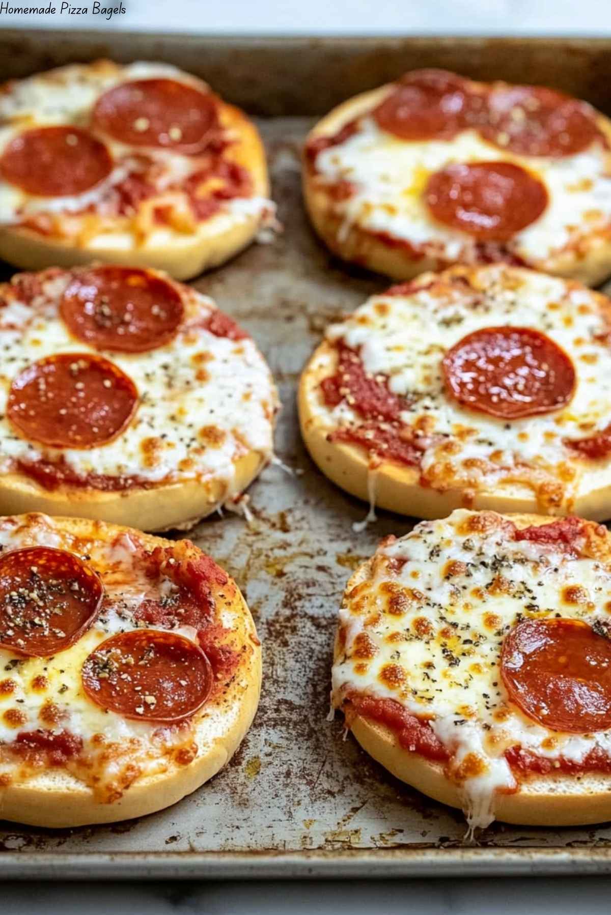 Enjoy the convenience of these Homemade Pizza Bagels that are perfect for a quick snack or meal. With crispy bagels topped with pizza sauce, gooey melted mozzarella cheese, and mini pepperoni, these bagels are sure to satisfy your pizza cravings.