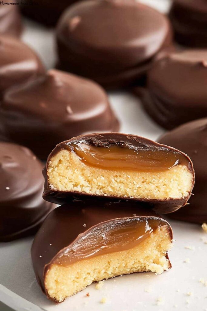 - Dip and Coat: Dip each caramel-coated cookie into the melted chocolate, ensuring it’s fully coated. Place on a parchment-lined tray.