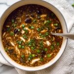Hot and Sour Soup with Chicken and Mushrooms Recipe pairs beautifully with simple steamed jasmine rice or light stir-fried greens like bok choy or snow peas. I also love serving it alongside crispy spring rolls or dumplings for a more indulgent meal. It’s great as a starter or a satisfying main when you want something warming.