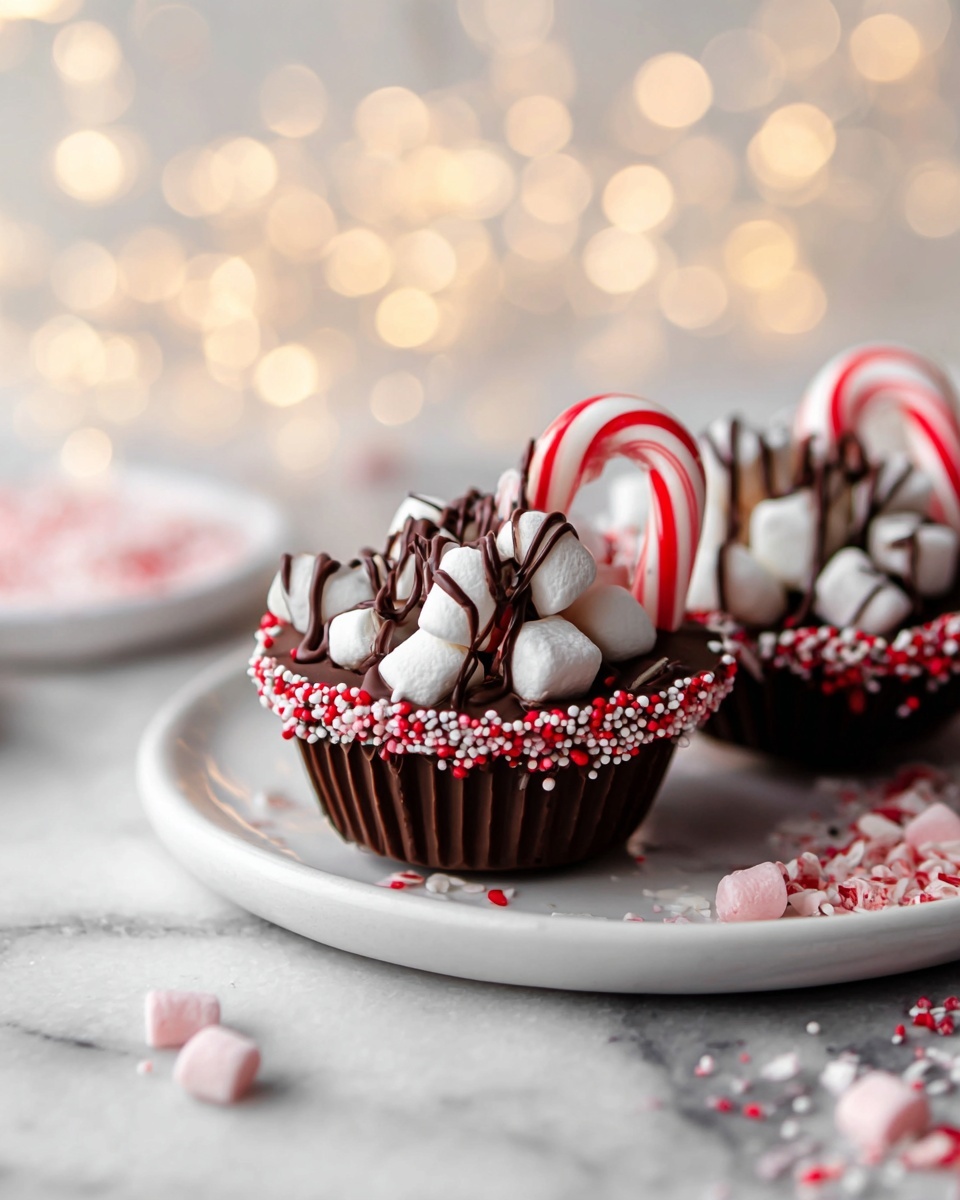 - Assemble the Cups: Once the chocolate mugs are set, carefully remove them from the molds. Fill each chocolate cup with a spoonful of the hot cocoa mix, mini marshmallows, and a small candy cane for stirring.