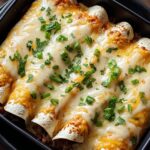 These Jalapeño Popper Cheesy Chicken Enchiladas combine tender shredded chicken with a creamy, spicy mixture of cream cheese, cheddar, and jalapeños, all wrapped in warm flour tortillas and baked to perfection under a layer of tangy green chili enchilada sauce and Monterey Jack cheese. Garnished with fresh green onions, this dish is a vibrant and flavorful twist on classic enchiladas, perfect for a comforting dinner that’s both cheesy and mildly spicy.