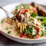 For the dressing, combine ½ cup creamy peanut butter with 2 teaspoons tamari, 2 teaspoons maple syrup, 2 teaspoons fish sauce, 1 minced garlic clove, 1 teaspoon chopped ginger, 3 teaspoons sriracha, 2 tablespoons fresh lime juice, and ½ cup water. Whisk it all until smooth, adding more water if needed so it’s pourable but still rich. This dressing is the star partner to the pork and noodles—it’s nutty, tangy, and has that perfect subtle heat. I like to taste it as I go, adjusting lime or sriracha to my mood.