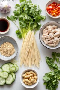 For the dressing, combine ½ cup creamy peanut butter with 2 teaspoons tamari, 2 teaspoons maple syrup, 2 teaspoons fish sauce, 1 minced garlic clove, 1 teaspoon chopped ginger, 3 teaspoons sriracha, 2 tablespoons fresh lime juice, and ½ cup water. Whisk it all until smooth, adding more water if needed so it’s pourable but still rich. This dressing is the star partner to the pork and noodles—it’s nutty, tangy, and has that perfect subtle heat. I like to taste it as I go, adjusting lime or sriracha to my mood.