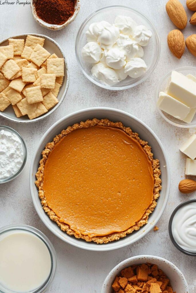- In a large bowl, combine the chopped leftover pumpkin pie, crushed graham crackers, vanilla frosting, and pumpkin pie spice. Mix until well combined.