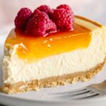 - Ripe mango slices and raspberries complement the flavors of the cheesecake.
