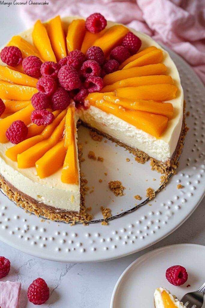 - Serve the cheesecake topped with mango slices, raspberries, and coconut flakes.